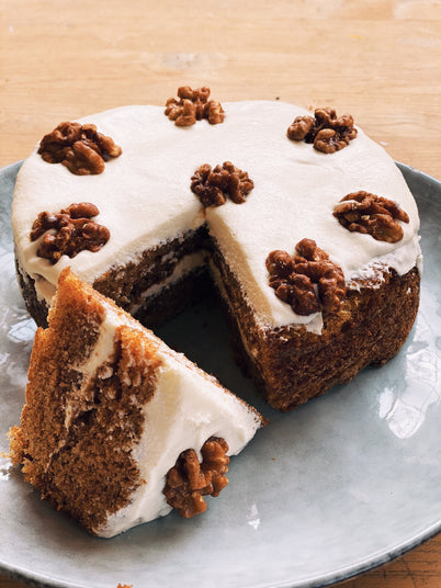 Bizcocho de zanahoria con crema de queso, mantequilla y chocolate blanco.